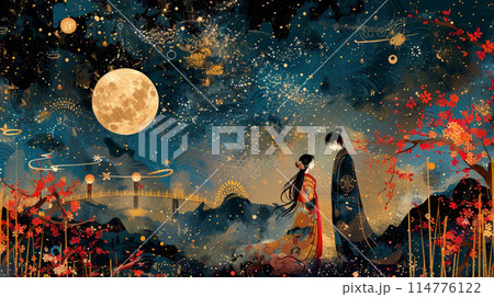 中國的節日七夕,牛郎跟織女跟鳥的情人節,卡通,插畫,漫畫,向量