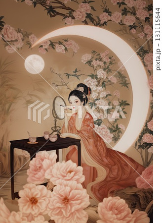 A beautiful moon goddess from ancient Chinese mythology doing makeup under soft moonlight in flowing hanfu, capturing the legendary story of Chang'e in the lunar palace and timeless elegance