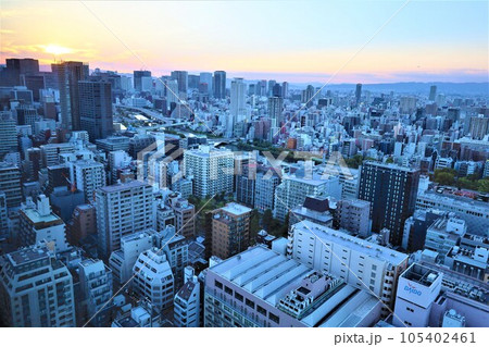 ザ・ファインタワー大手前の三十一階ラウンジからみる大阪城や天満橋、中之島、梅田の景色、夕暮れ時