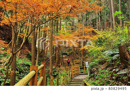 神奈川県立七沢森林公園 沢のさんぽ道4号橋付近の紅葉とハイカー