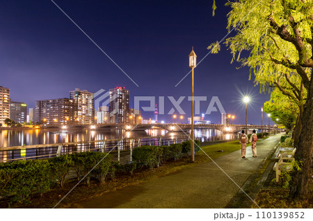 ライトアップされた萬代橋と信濃川河畔のの夜景