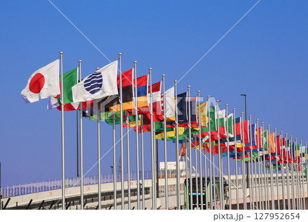 EXPO2025 大阪・関西万博 東ゲート付近に並ぶ万国旗がはためく風景 大阪市此花区夢洲