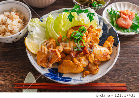 玉子焼に大きい鶏肉が乗っている照り焼きチキン丼