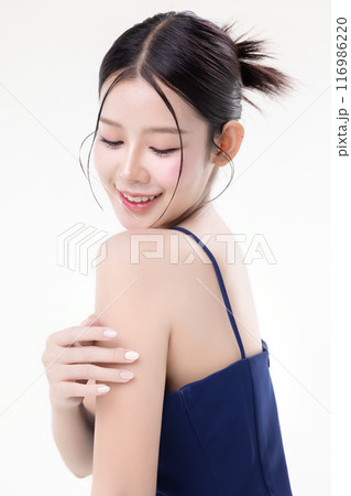 Beautiful young Asian woman with K beauty style makeup and perfect skin using lotion on isolated white background. Facial and skin care concept for commercial advertising.