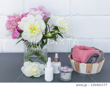 Natural cosmetics closeup in bathroom with flowers, minimalistic beauty concept