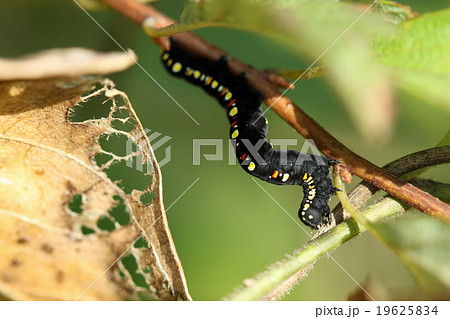 生き物 昆虫 ヒメエグリバ、黒地に赤黄の斑点が目立つ幼虫。成虫は地味な姿になります
