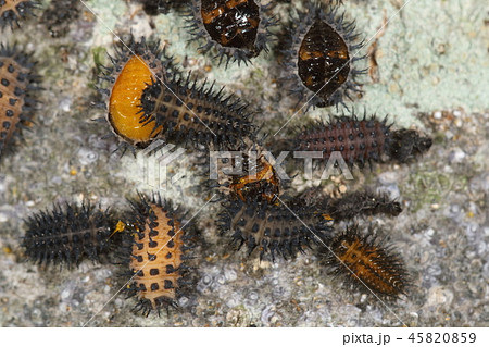 生き物 昆虫 ヒメアカホシテントウ、蛹と幼虫です。バラ科の木につくカイガラムシ類の天敵、農家の味方