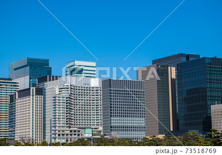 日本の東京都市景観 皇居前広場から青空に映える大手町や丸の内のオフィス街などを望む