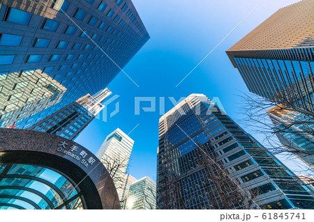 日本の東京都市景観 大手町駅(出入口)と摩天楼