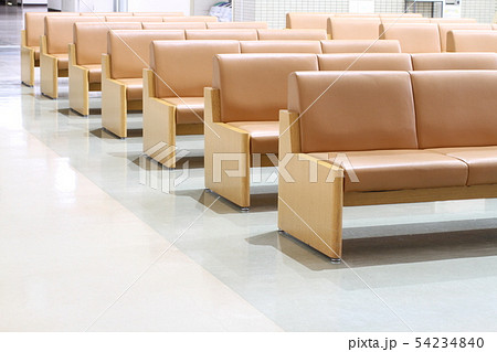 休日の病院のロビー、無人、待合室の椅子
