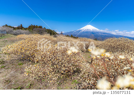 【富士山素材】白糸自然公園から見る富士山とミツマタの花【静岡県】