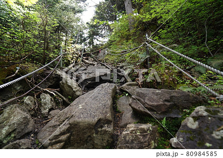 志賀高原で目立つ名山 笠ケ岳に峠の茶屋から登る 山頂に近づくと岩が多く、ロープもある