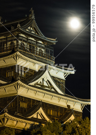 日本 広島県広島市の広島市中央公園内にある夜になってライトアップされた広島城の天守閣と満月