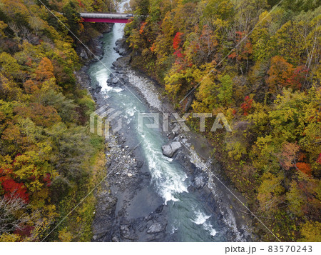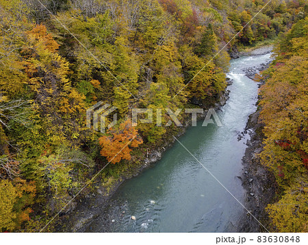 空撮 沙流川渓谷の紅葉(北海道 日高)