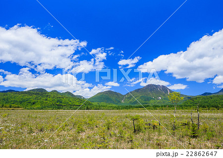 初夏の小田代ヶ原と太郎山、山王帽子山、三岳