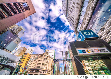 日本の東京都市景観 明日へ。脱コロナ、銀座や銀座駅出入口。青空が広がる…輝く時代へ=10月16日