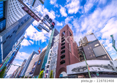 日本の東京都市景観9月24日。東京・銀座。セイコーハウス銀座などを望む