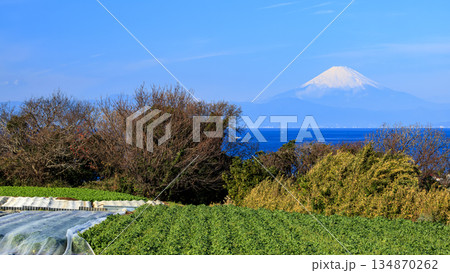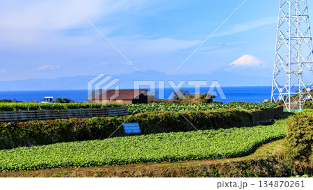 青空に映える新緑の大根・キャベツ畑と冠雪した富士山