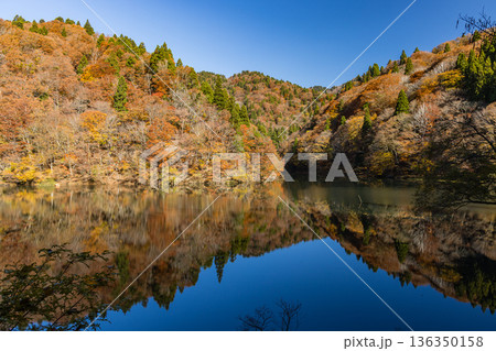 日本 鳥取県八頭郡智頭町の芦津渓谷にある三滝ダムの湖面に映る紅葉した木々