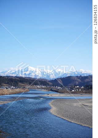 新潟県長岡市越後川口牛ヶ島からの越後三山雪景色・信濃川風景