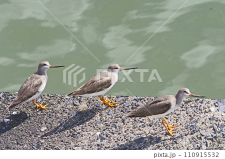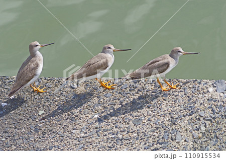 嘴が上に反ったオレンジ色の足の水鳥ソリハシシギ三羽