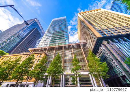 日本の東京都市景観 金融・経済の中心、丸の内のオフィス街。三菱UFJ信託銀行などを望む