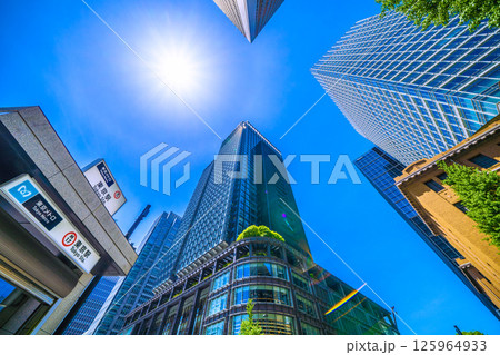 日本の東京都市景観 7月。猛暑…東京・丸の内のオフィス街。左は新丸ビル。(画面右方向は大手町)