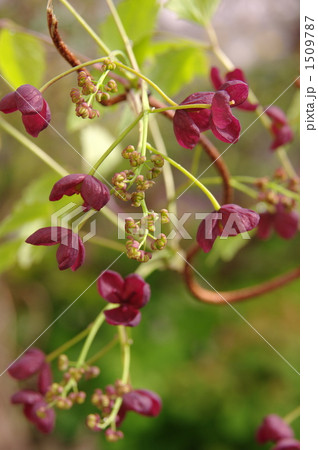 春の森景色 森に咲く紫のミツバアケビの花