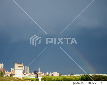 埼玉県川口市荒川堤からの風景(雨上がりに架かる虹)