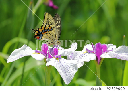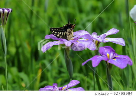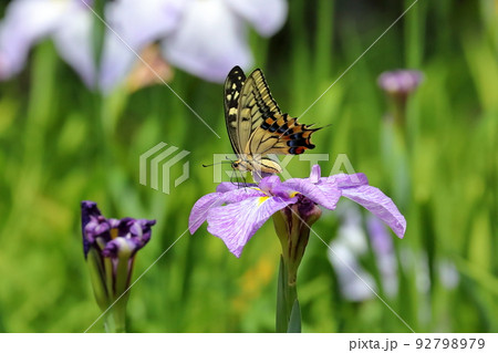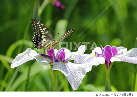 新潟県南魚沼市小栗山 上の原公園内菖蒲園の花しょうぶとアゲハ蝶