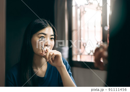 Young adult asian woman makeup eyelash and face skincare before mirror in dress room at home.