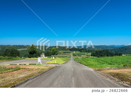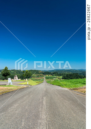 農道の真ん中に天に続くような一本道がある新潟の風景