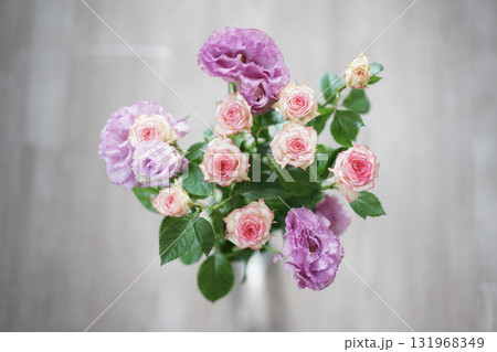 Flower arrangement with pink peonies, tulips, and roses on a light background in springtime setting indoors