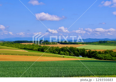 夏の北海道 剣淵町 丘陵の麦畑からの眺望