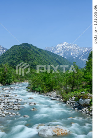 剱岳の残雪と早月川の清流風景_縦