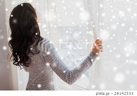 close up of woman opening window curtains