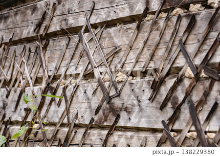 Weathered wooden wall texture with diagonal lath creating a rustic pattern