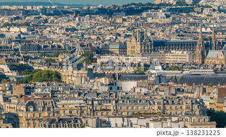 Aerial panorama above many houses rooftops in a Paris timelapse