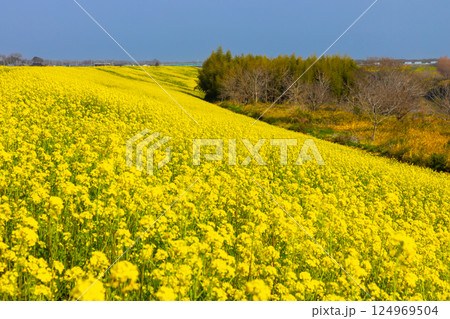 埼玉県川越市古谷上 荒川入間川沿い堤防土手に広がる菜の花畑の景色
