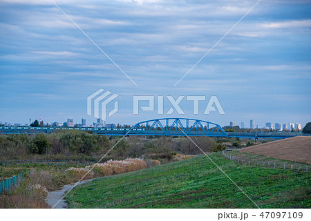 青空と荒川 武蔵野線と遠くにビル群 上江橋からの眺め