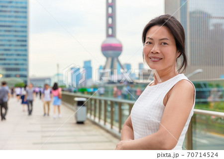 Asian middle age woman model smiling happy in Shanghai city street. Chinese mature businesswoman China professional