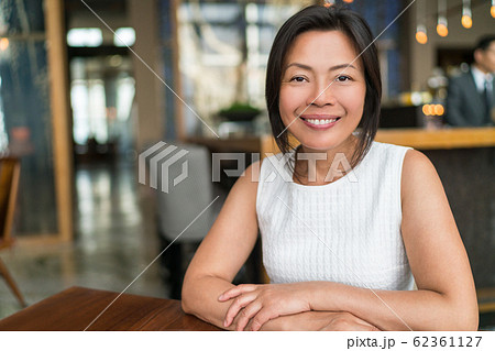 Happy elegant Asian middle-aged businesswoman smiling portrait. Beautiful mature Chinese business woman in fancy restaurant in Shanghai, China