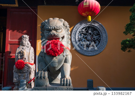 Chinese Imperial guardian lion at Longhua temple in Shanghai