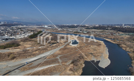 相模川と町並み(空撮) - 神奈川県厚木市・相模原市,日本