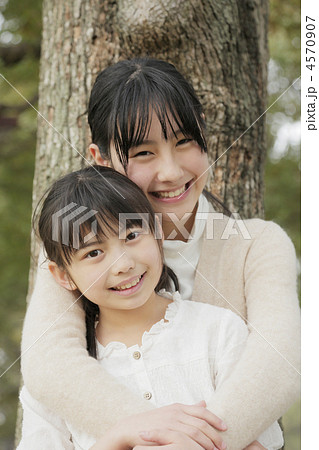 低学年の男の子に話しかける小学生の女の子(笑顔)