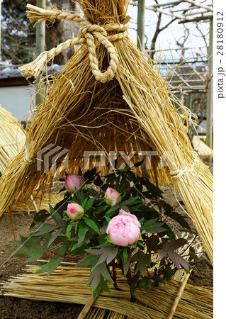 藁囲いにも雪が積もった上野東照宮ぼたん苑のピンクの冬牡丹(2)