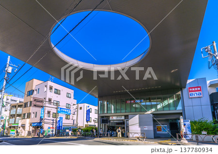 日本の東京都市景観 東急電鉄大井町線 上野毛駅 正面口などを望む.=7月19日