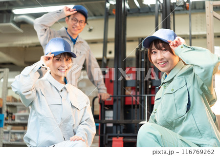フォークリフトの前に立つ男女3人の作業着姿の作業員