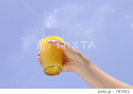 ドリンク(オレンジジュース)を持つ女性の手と空