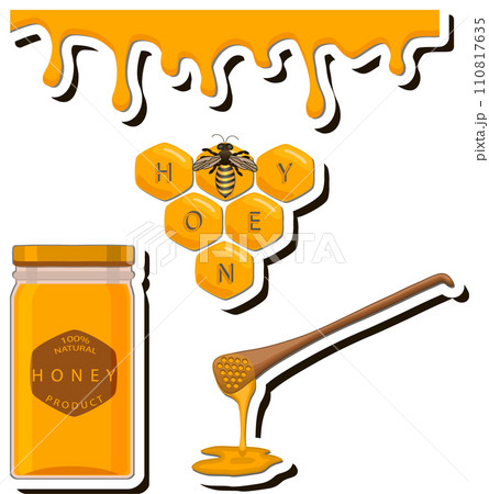 Illustration on theme sugary flowing down honey in honeycomb with bee